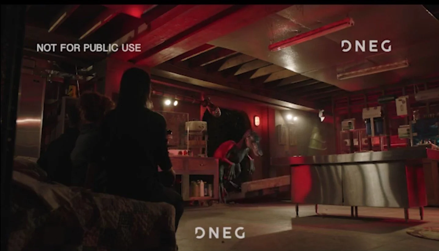 Integrated CG dinosaur and blanket elements as Old Lace collapses on the stairs. Added pillow impact interaction, composited fake and CG shadows for grounding, and performed heavy roto and plate cleanup to support realistic contact and occlusion.