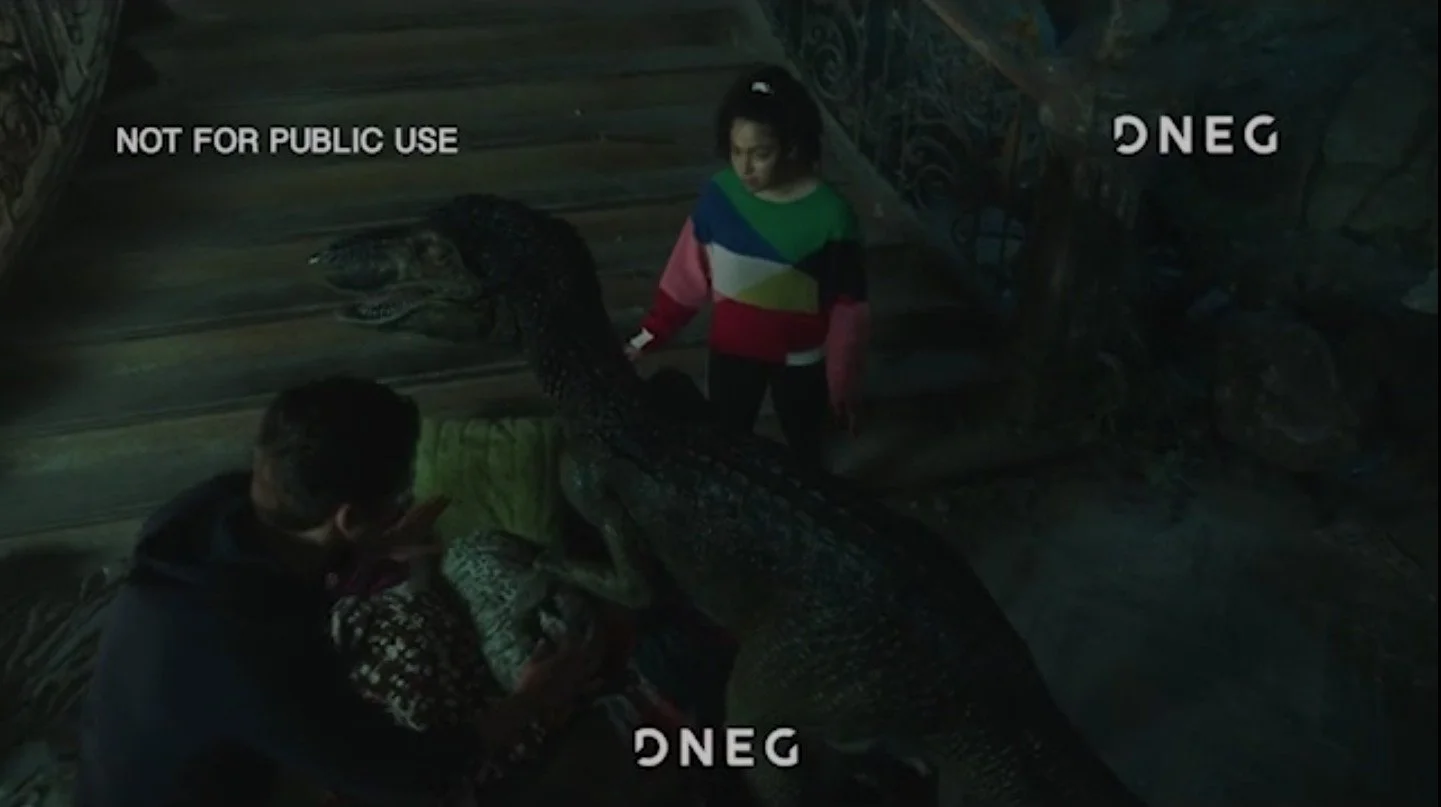 Executed extensive in-comp relighting of the CG dinosaur to blend with dappled forest lighting. Completed motion-blurred roto for multiple tree layers at varying depths to ensure proper integration and depth cues. Added fake and CG shadows, and enhanced interaction with foreground trees—including secondary motion and deformation—when the tail makes contact. This shot required complex layering and detailed timing to ground the CG within a dynamic, natural environment.